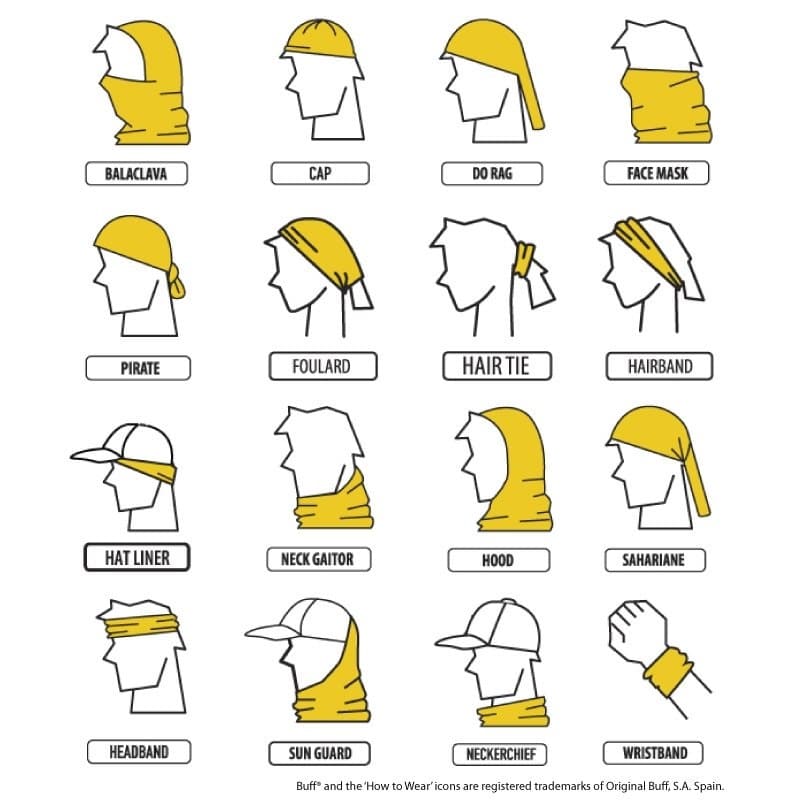 Die in der Bildgalerie enthaltene Infografik zeigt 16 verschiedene Möglichkeiten, ein Buff zu tragen. Manche Kombinationen sind etwas tricky, aber das Schlauchtuch wird mit einem Begleitzettel geliefert, der bereits einige Kniffe enthält. Der grundsätzliche Trick bei Buffs besteht im Drehen und Winden des Schlauchtuchs, um eine der beiden offenen Seiten zu schließen. Ob beim Wandern, Radfahren, Joggen oder im Alltag, das Buff ist eigentlich immer ein nützlicher Begleiter. Das Schlauchtuch kann wahlweise als Mütze, Stirnband, Kopf- oder Halstuch, Sturmhaube, Arm- oder Haarband getragen werden.