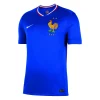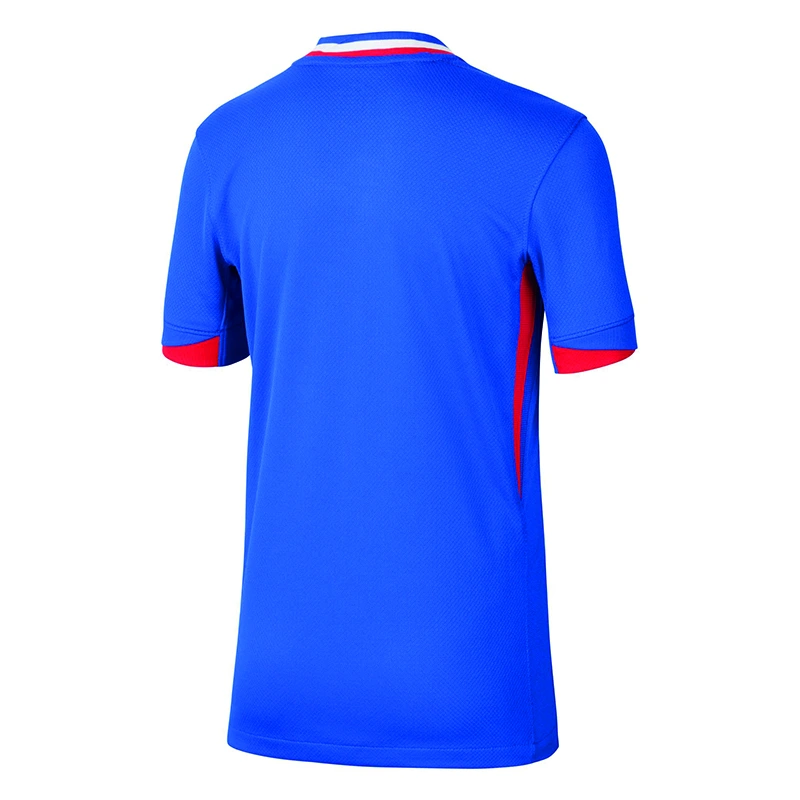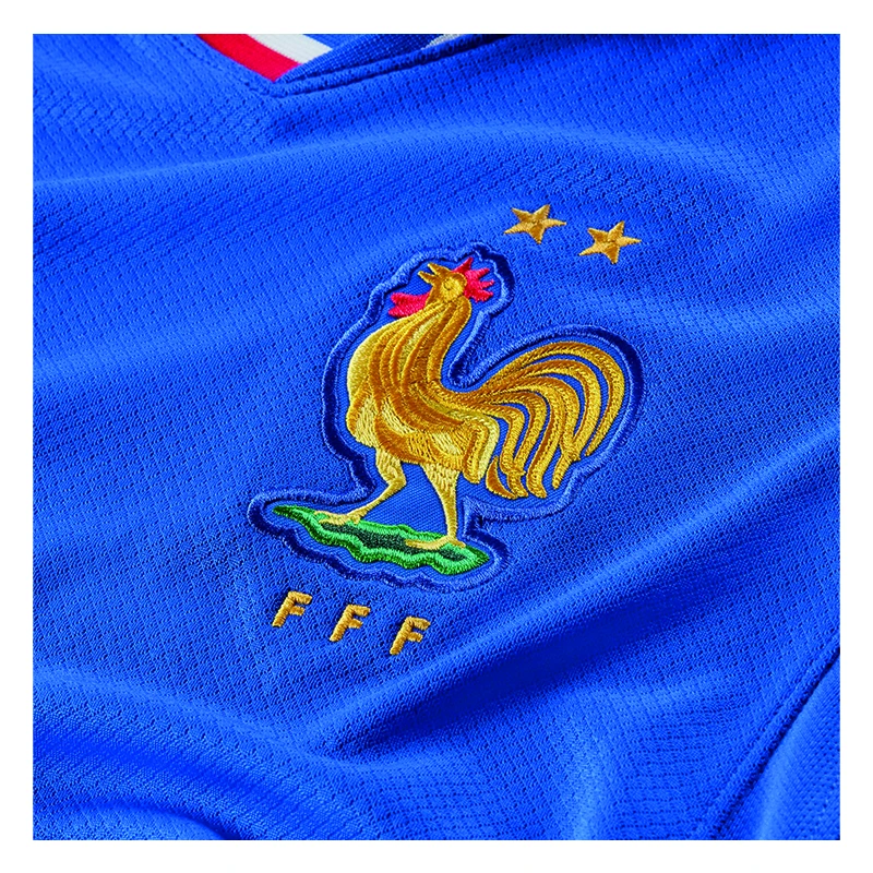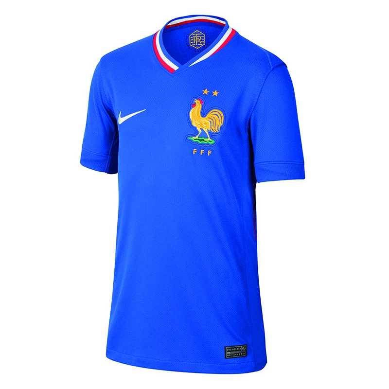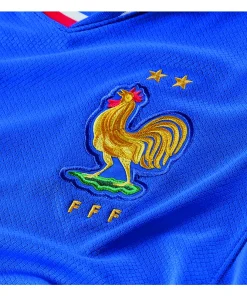 Das FFF 2024/25 Heimtrikot basiert auf den klassischen Fussballtrikots Frankreichs der 1960er-Jahre und erinnert gleichzeitig an die lebendige und vielfältige Kultur des Landes. Das übergrosse Bild eines Hahns auf der Brust und die Bündchen in den Farben der französischen Trikolore lassen keinen Zweifel daran, welches Land dieses Trikot repräsentiert.