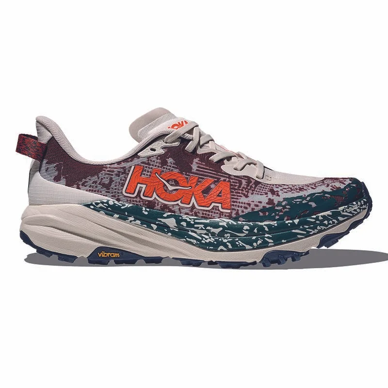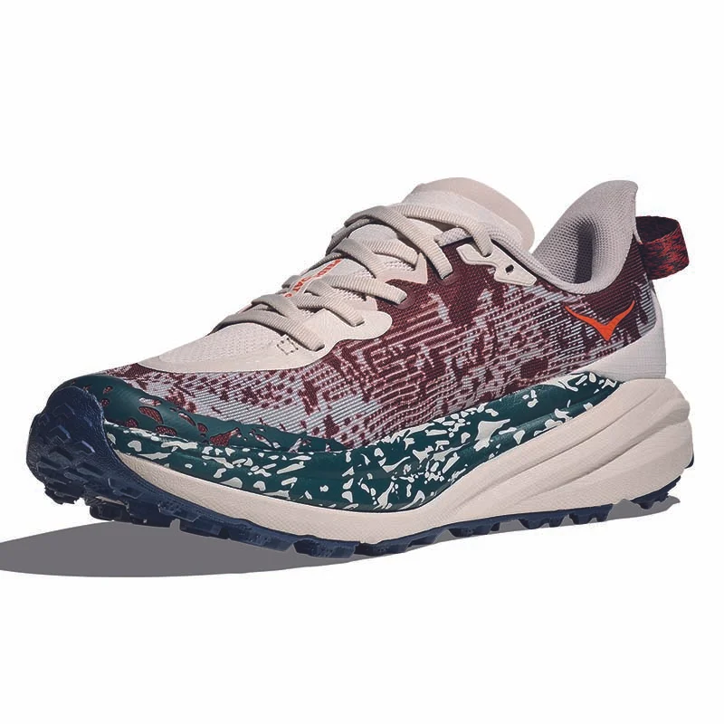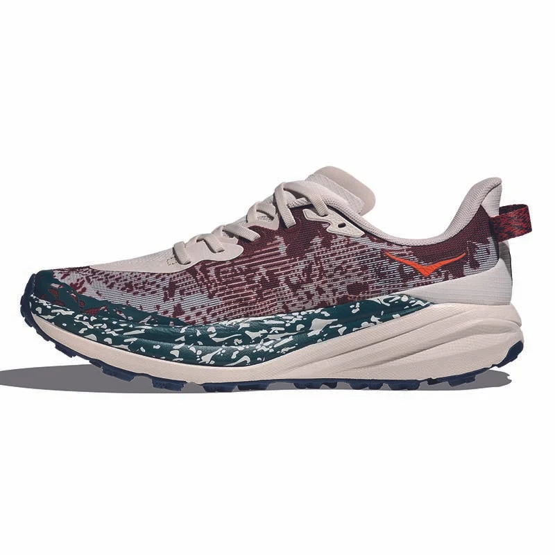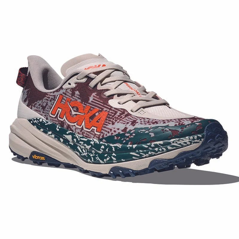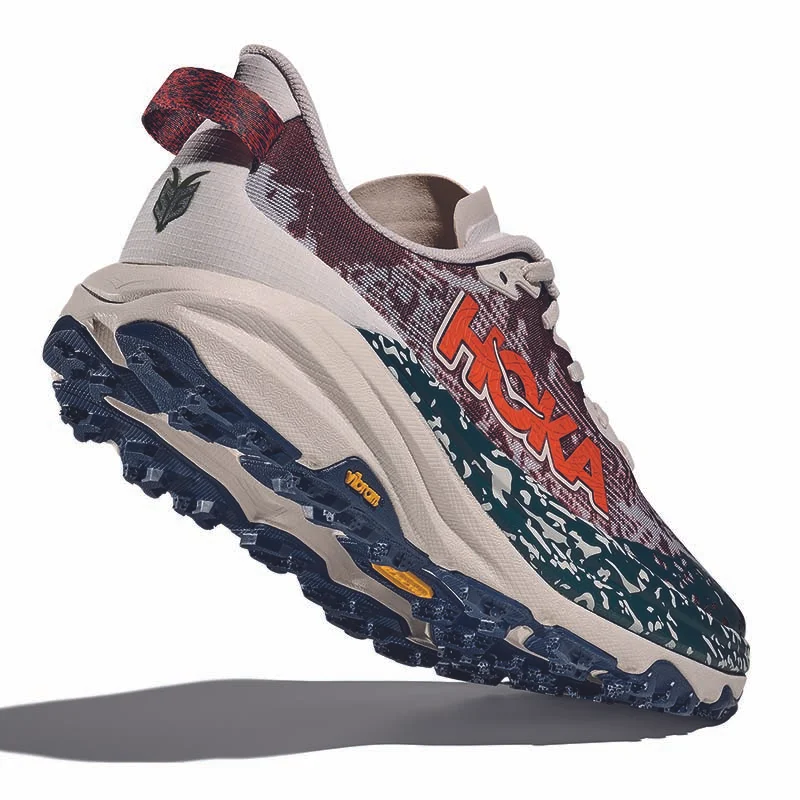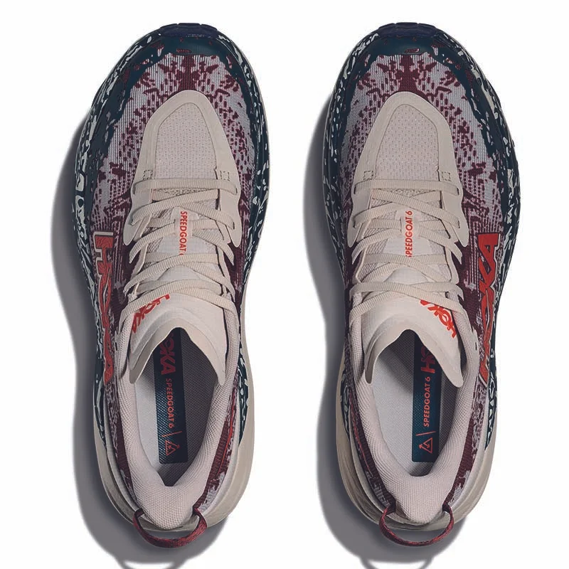 Reaktionsfähiges Laufgefühl mit gutem Halt auf anspruchsvollem Terrain. Dieser Laufschuh ist einfach einzigartig. Warum? Der Speedgoat 6 vereint die bewährte Dämpfung von HOKA mit ausgezeichnetem Grip und ultraleichten Materialien, was ihn perfekt für anspruchsvolles Gelände macht. Die Neuauflage ist ein richtiges Arbeitstier: Sie bietet ein Obermaterial aus atmungsaktivem Gewebe, ein integriertes „Chassis-System“, das den Fuss umschmiegt, eine noch weichere Lasche mit zwei Zwickeln und eine überarbeitete Ausrichtung der Stollen, die in Anlehnung an den Schuhnamen von den Hufen einer Ziege inspiriert sind.