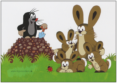 Maulwurf auf Maulwurfshügel mit Hasenfamilie (Der kleine Maulwurf) – TAURUS Kunstkarten