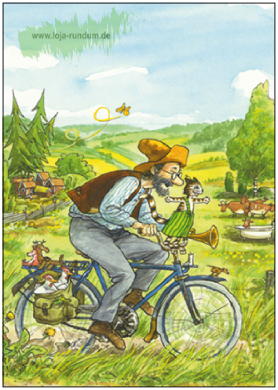 Pettersson auf Fahrrad/ Pettson cyklar – Pettersson und Findus – TAURUS Kunstkarten
