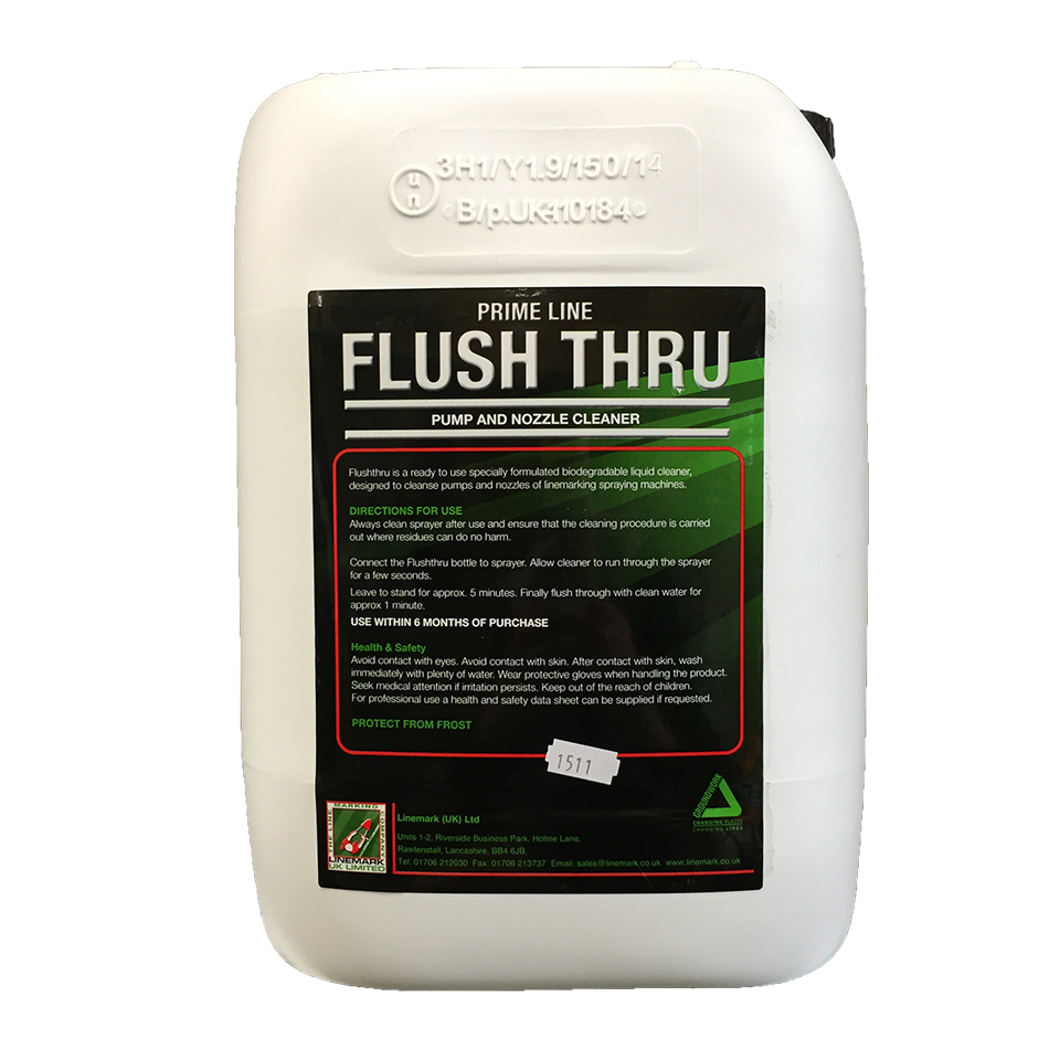 Flush Thru ist ein gebrauchsfertiges, biologisch abbaubares Reinigungsmittel zum Reinigen der Pumpen und Düsen von Markiermaschinen. Anwendung: Düsen und Filter in einen Kunststoffbehälter legen. Flush Thru hinzugiessen, einige Minuten vollsaugen lassen. Herausnehmen und mit Wasser abspühlen.
