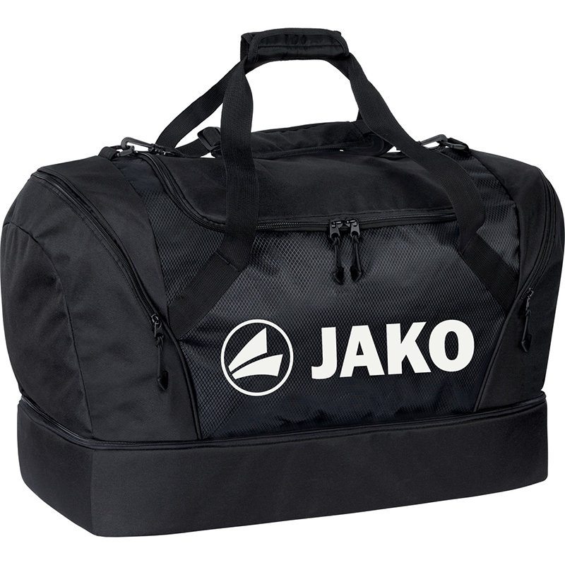 Zusätzlich zum Bodenfach befinden sich rechts und links jeweils eine Seitentasche mit Reißverschluss. Die rechte Seitentasche ist ein Tiefes Nassfach. Hier kannst Du deine getragene Sportkleidung nach dem Sport verstauen. Im Hauptfach befindet sich weiterhin eine kleine Innentasche mit Reißverschluss. Deine Wertsachen kannst Du in ihr sicher transportieren. Bestell dir jetzt die geräumige Sporttasche von JAKO im Onlineshop.